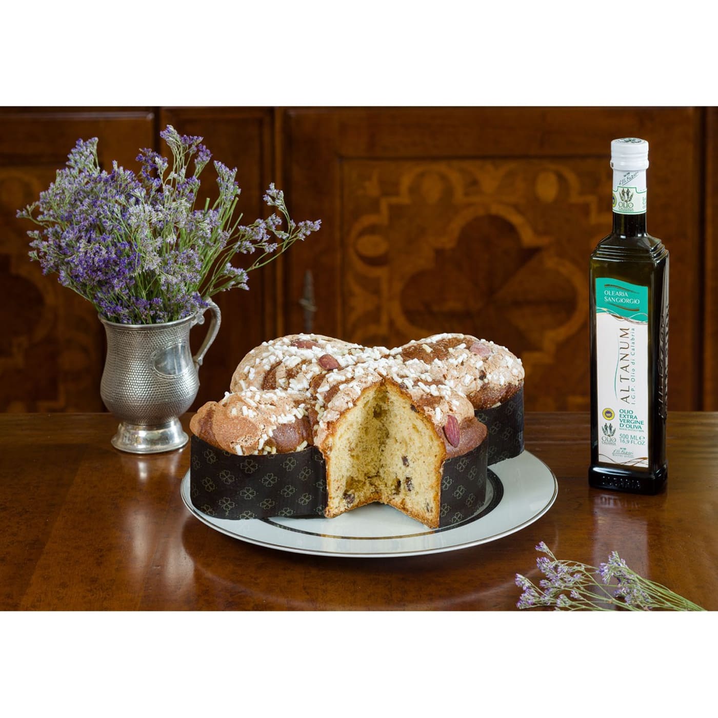 Ingredienti impasto: Farina di GRANO tenero”0″, Fichi Secchi (di origine Calabria-ltaly)(13%),Olio extra vergine d’Oliva ALTANUM (12%), gocce di Ciocc.Fondente (zucchero, pasta di cacao (cacao 39,1% min.) burro di cacao, emulsionante: lecitina di SOIA, Vaniglia naturale) (09%), tuorlo d’UOVO, zucchero, LIEVITO MADRE NATURALE, emulsionanti: Mono digliceridi degli acidi grassi, Miele, Sale, LATTE scremato in polvere, Destrosio, Aromi. Ingredienti ghiaccia: Zucchero, RISO, ARMELLINA (?%)(contiene SOLFITI), amido modificato, Aromi. ALLERGENl: Può contenere possibili tracce di cereali contenenti glutine, uova, soia, frutta a guscio, lattenattosio.